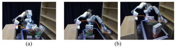最后是 Q5,也就是最有现实味道的一组实验。作者没有继续使用采样规划器生成“专家轨迹”,而是让人通过 kinesthetic teaching 拖动 Panda 机械臂做抓取放置示教,采集约 100 条演示轨迹,再通过噪声扩充到约 4k 条。测试时,在场景里额外加入谷物盒、茶盒等训练时没有的物体。结果显示:单纯diffusion prior会撞上新障碍,而MPD借助碰撞代价引导后,能够在保持接近人类示教风格的同时绕开障碍并到达目标位姿。这一步很能说明方法的实际价值。