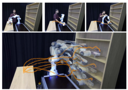 图6:(上图)在EnvWarehouse-RobotPanda环境中,通过动觉教学为拾取和放置任务进行人类演示。末端执行器的轨迹用橙色表示。(下)几个演示的叠加。机器人配置显示在演示的最后。