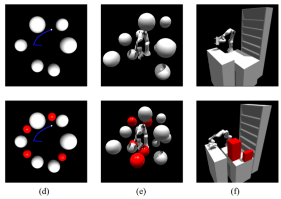 如图4所示,论文构建了从 2D 到 7 自由度机械臂、从简单障碍到仓储场景的一系列测试环境,并且专门在下方红色障碍中展示了测试阶段新增物体,这对验证模型的适应能力非常关键。