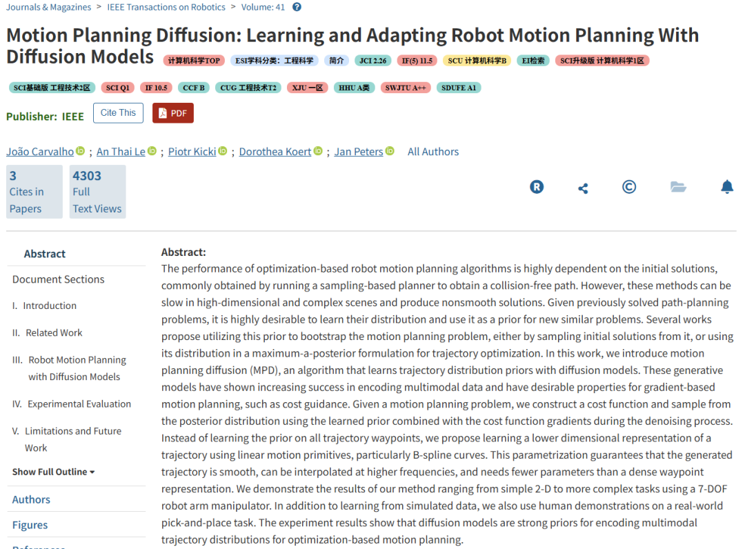 引文格式:Carvalho J, Le A T, Kicki P, Koert D, Peters J. Motion planning diffusion: learning and adapting robot motion planning with diffusion models[J]. IEEE Transactions on Robotics, 2025, 41:4884-4901.