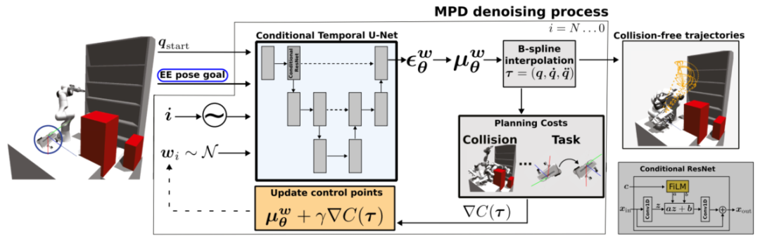 如图2所示,MPD 的推理流程非常清晰:起始关节位姿和目标末端位姿作为条件输入,扩散模型在去噪过程中不断输出 B-spline 控制点,并结合规划代价梯度,把样本逐步推向无碰、平滑且任务可达的轨迹区域。