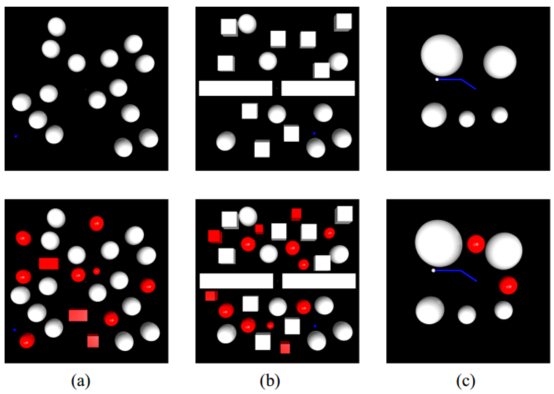 图4:用于运动规划实验的环境,具有不同的机器人模型和不断增加的复杂性。在二维任务中,机器人用蓝色表示(作为RobotPointMass2D的点)。最下面一行显示了带有额外障碍(红色)的任务,这些障碍在培训中不存在。