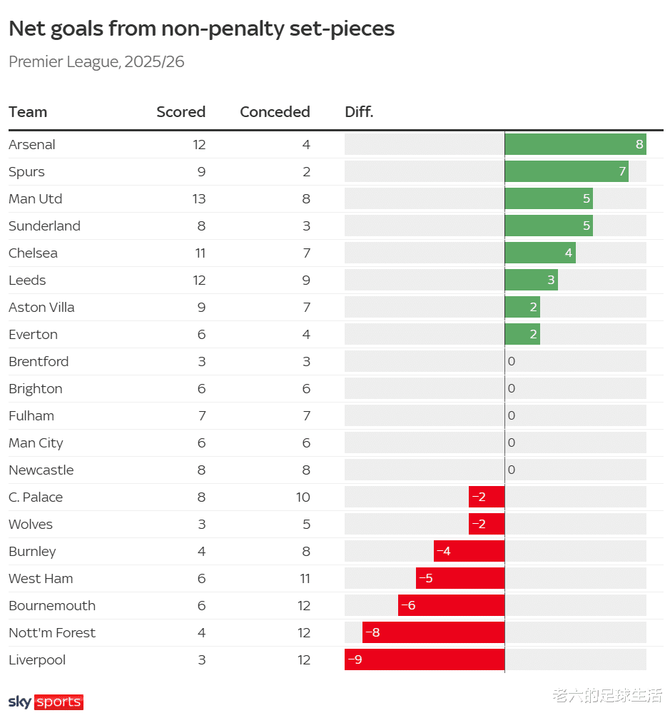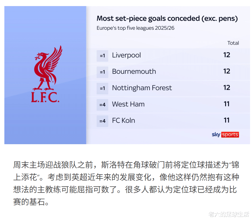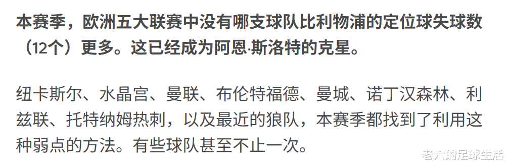 球队定位球的问题给了其他球队机会,本赛季的纽卡、水晶宫、曼联甚至狼队都利用了利物浦的弱点在场面上取得优势。