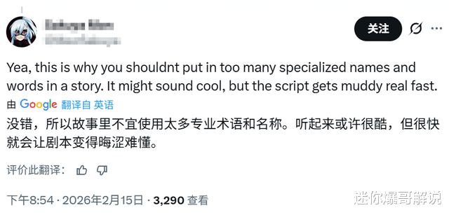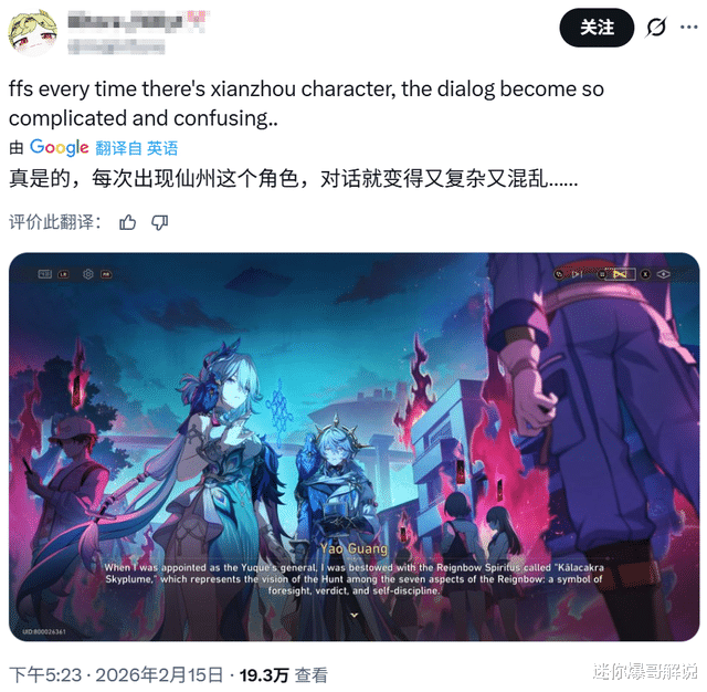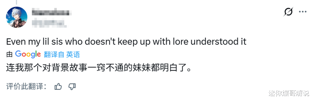 但更多的玩家表示反对,他们认为,爻光的对话虽然看起来很复杂,但核心意思非常直白,只要顺着剧情看下去,完全不影响理解。更有玩家调侃,就连自己对背景故事一窍不通的妹妹,都能轻松看懂剧情走向。所谓 “看不懂”,更多只是不习惯这种说话风格而已。
