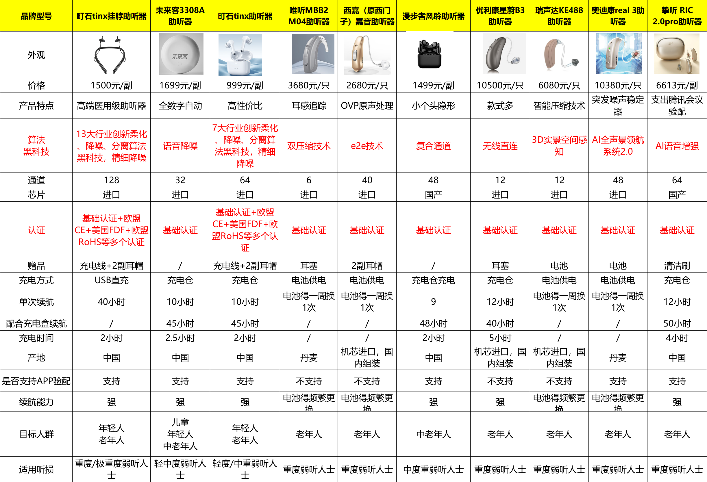 挑选助听器不仅仅是看广告或听推荐,数据对比才是最直接高效的方式。通过对比表格,你能清楚了解各款产品在不同维度上的表现。下面的表格展示了参与本次测评的几款助听器的数据,帮助你做出更加理性的决策。