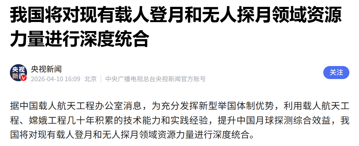 中国探月释放一个不寻常的重磅信号!4月10日,根据中国载人航天办公室,我国将对现有载人登月和无人探月领域资源力量进行深度统合。与此同时,嫦娥七号探测器已经运抵文昌航天发射场,计划在今年下半年择机发射。