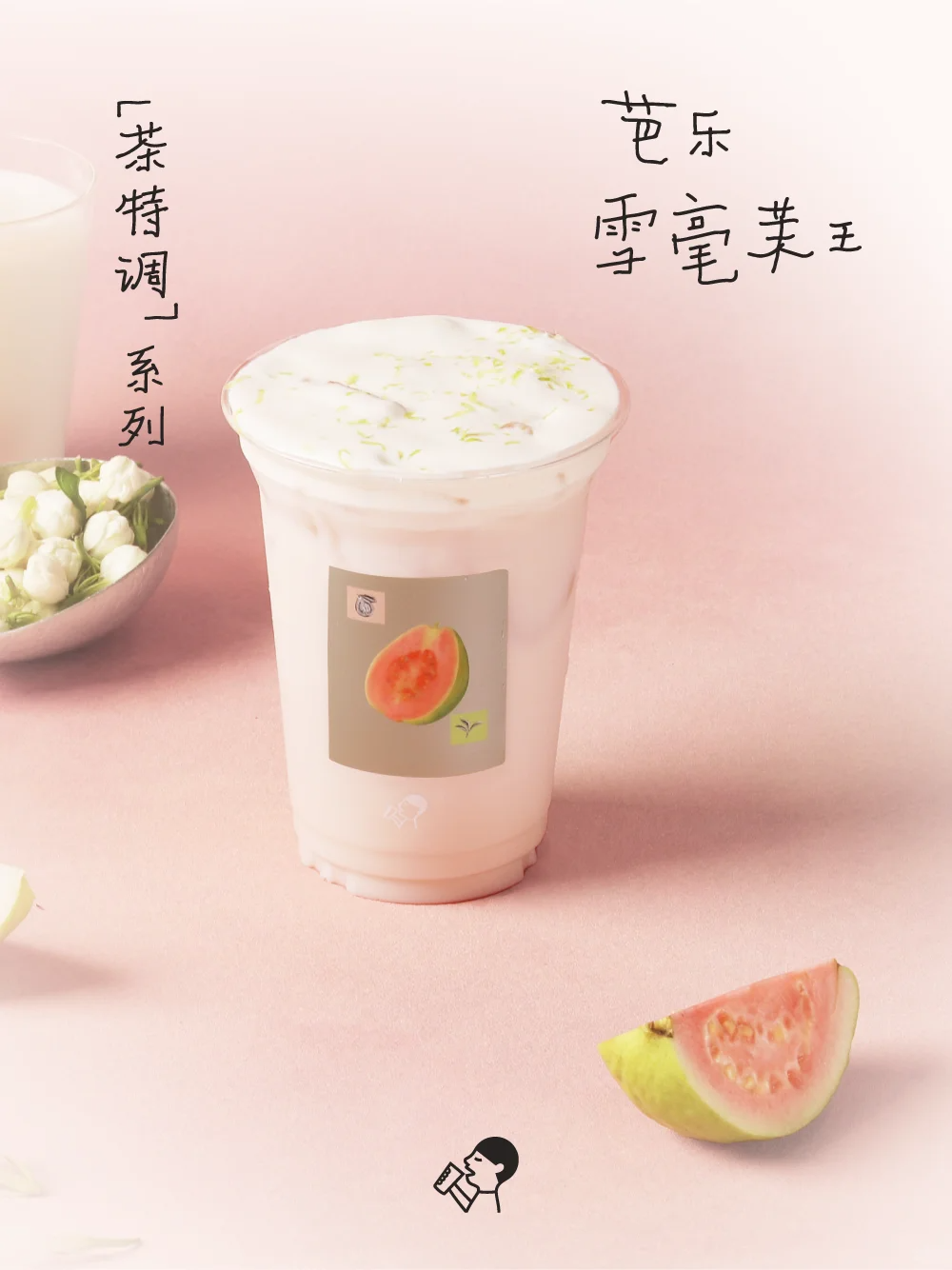甜,是红芭乐与白芭乐自带的;香,是每斤茶吸足5500朵茉莉的九窨雪毫茉王给的;醇,是源牧3.8冷藏真牛乳作的乳底;轻,是浮在上面的芭乐云顶透出来的。