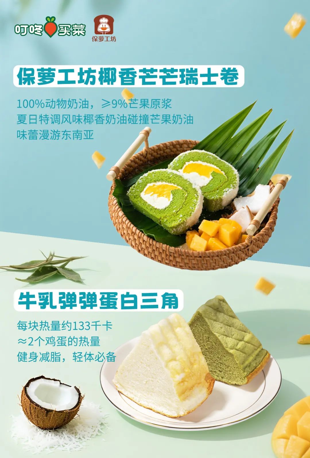 叮咚买菜上新「保萝工坊椰香芒芒瑞士卷」、「牛乳弹弹蛋白三角蛋糕」