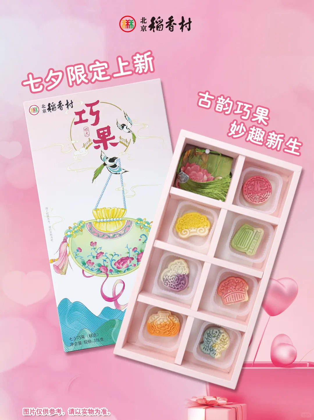 芝士山楂馅、芒果甘露馅、芋头馅、豆乳芝士胡萝卜馅、肉松蛋黄馅、炼乳馅、抹茶红豆馅,7款创意口味搭配浪漫造型,加一枚祈福荷包,把千年浪漫化作了可触可尝的甜蜜。