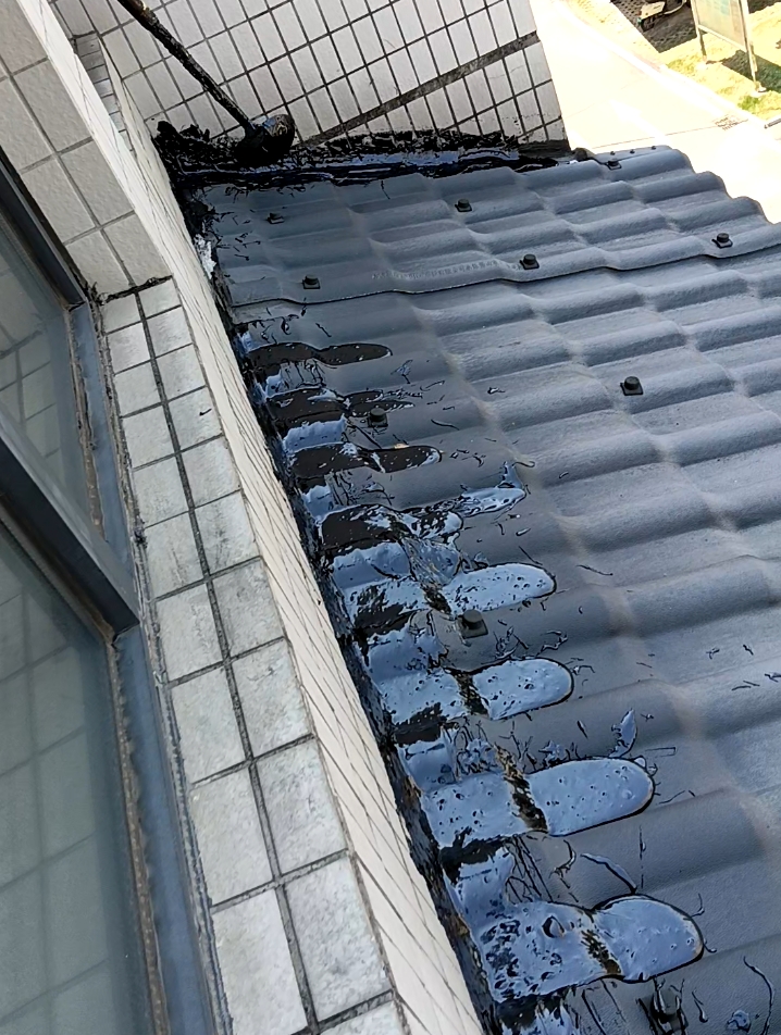 师傅开始动手了。他先清理了漏水的地方,然后调制牛皮胶。看着他把胶往树脂瓦的缝隙里倒,我却发现了一个问题:师傅倒了很多胶进去,但真正用于补漏的部分似乎很少,大部分都顺着瓦沟流走了。我忍不住问师傅:“这样会不会太浪费了?”师傅解释说,树脂瓦的结构比较特殊,缝隙多,必须多倒一些胶才能确保每个缝隙都被填满,不然还是会漏水。虽然觉得有点心疼,但为了彻底解决问题,也只能这样了。