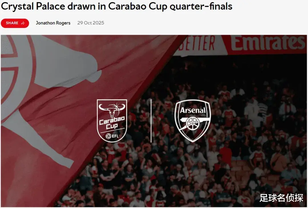 官方:阿森纳将在联赛杯四分之一决赛中主场对阵水晶宫,比赛将在12月15日开始的一周里进行,具体时间待定。