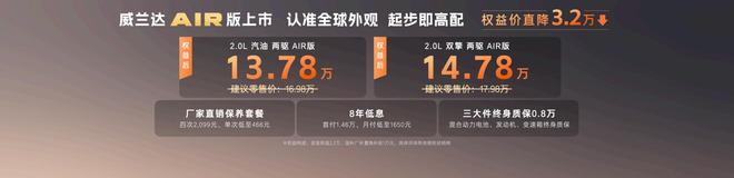 全新换代威兰达AIR版入门即高配,13万元起售价格也是非常有诚意的,提供的厂家兜里质保相当于给消费者吃颗定心丸。