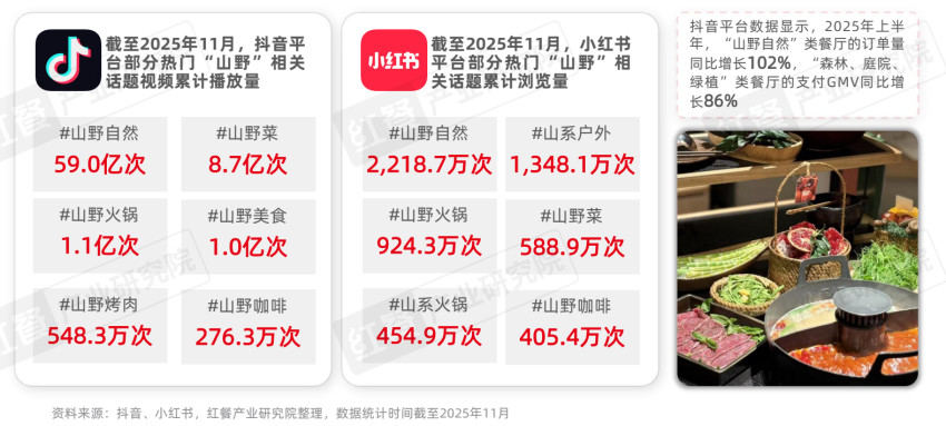抖音平台上,截至2025年11月,“山野菜”“山野火锅”等话题的视频累计播放量已突破亿次。另据抖音数据,2025年上半年,“山野”类餐厅的订单量同比增长102%。