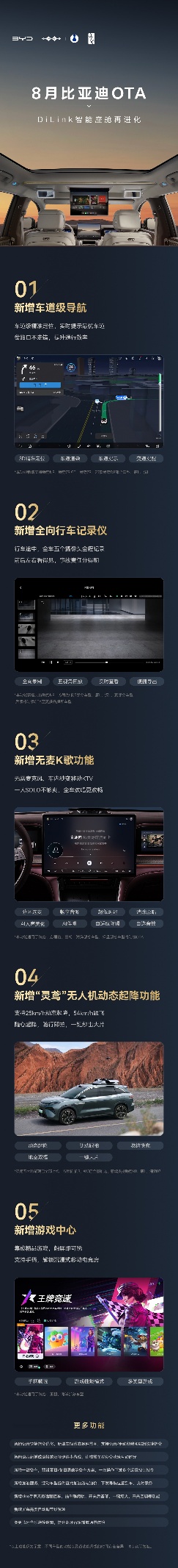 ①车道级导航 ②全向行车记录仪 ③无麦K歌 ④游戏中心 ⑤“灵鸢”无人机动态起降 这次的更新点比较多,涵盖了导航、安全、娱乐等多个方面的功能,实用性与趣味性都兼顾了。