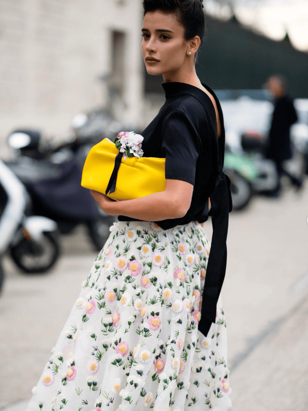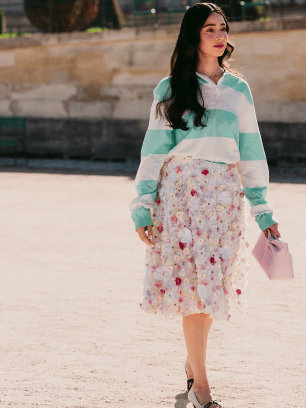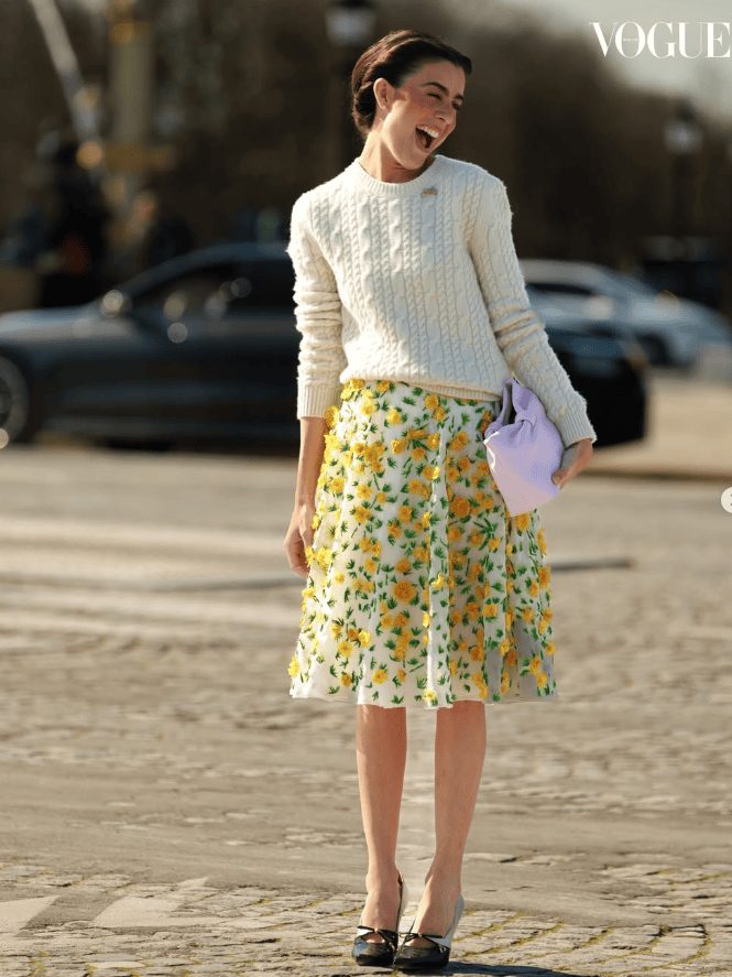 时髦精们将各种颜色的花朵半裙,与针织毛衣、衬衫、Polo衫撞了个满怀,描绘一副如画如诗的春日光景,太美了!