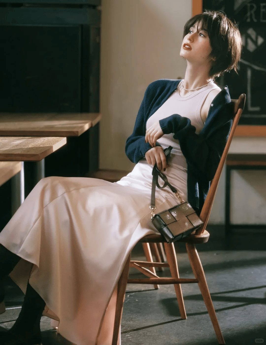 衬衫配缎面半裙,随意而不失高级感,包容度极高,轻松穿出毫不费力的松弛感。