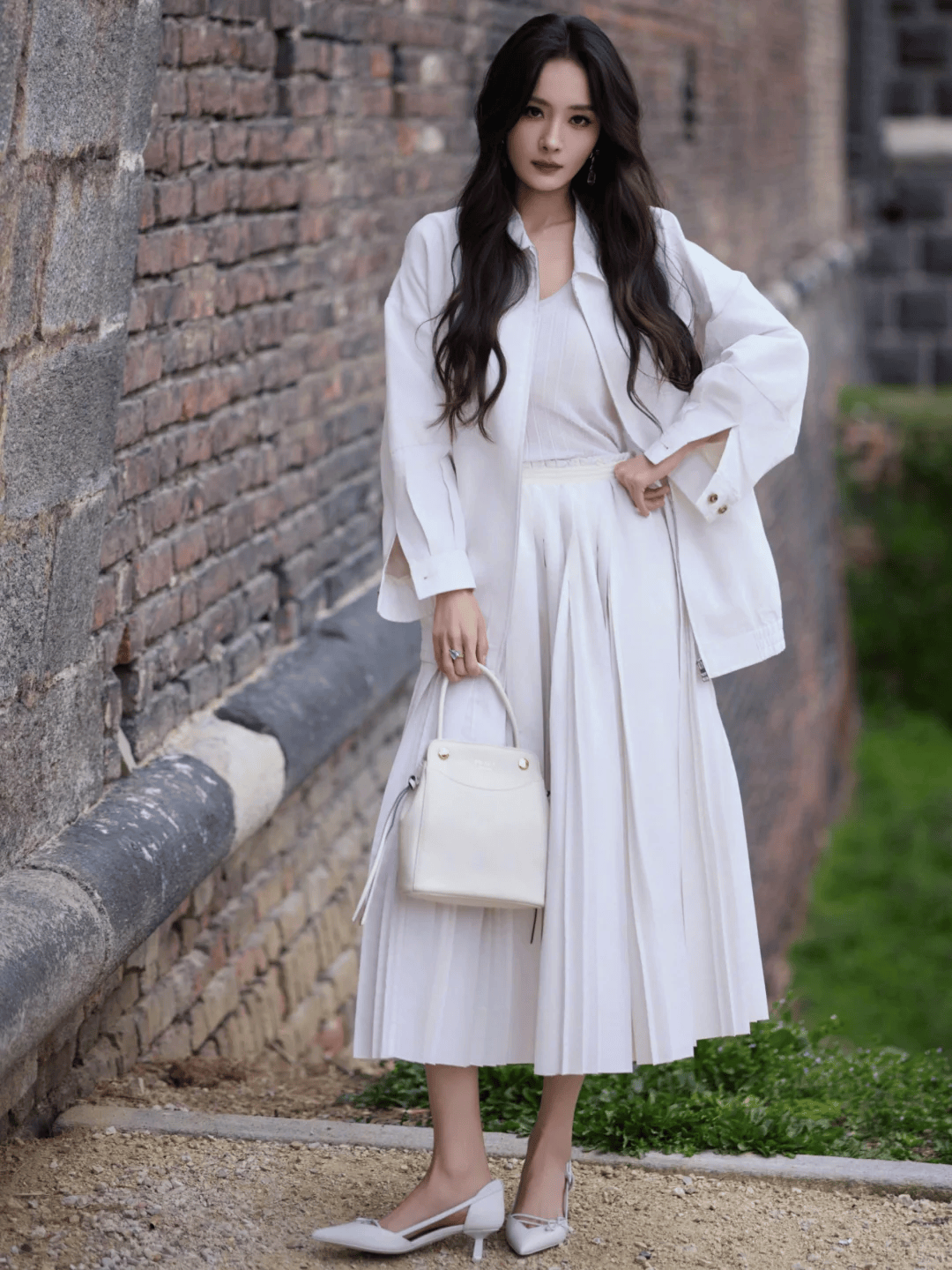 即使是all white穿搭,白色半裙也十分夺目显高级,既轻松又精致。