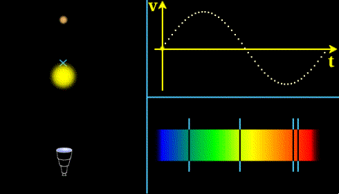 其原理可简单地描述为:当行星围绕其恒星公转时,行星的引力也会轻微地“拖拽”恒星,使恒星产生微小的、周期性的“摆动”。当恒星在摆动中朝向地球运动时,其星光光谱会发生“蓝移”;当它背离地球运动时,则会发生“红移”。