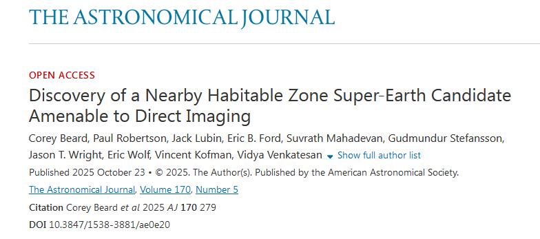 Discovery of a Nearby Habitable Zone Super-Earth Candidate Amenable to Direct Imaging,The Astronomical Journal, Volume 170, Number 5,DOI 10.3847/1538-3881/ae0e20