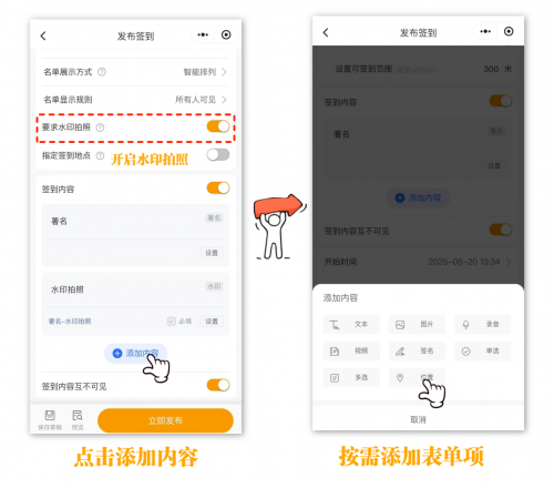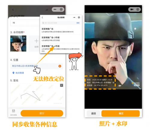 配合「水印拍照」,获取签到的时间、地点,数据真实无法篡改,提升管理效率。