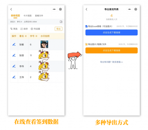 签到结束后所有数据自动汇总,可按需导出Excel、含图表格等,再也不用对着纸质表挨个录入;