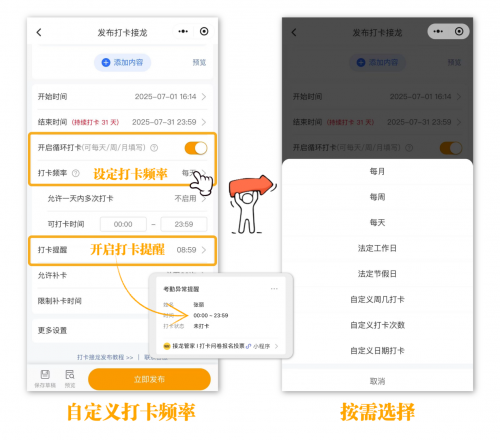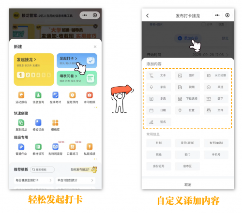 针对持续性的打卡活动,如每日夜跑、21天阅读等活动,可使用“打卡接龙”开启循环打卡,根据活动需求,自定义添加照片、文件、视频等收集表单项;