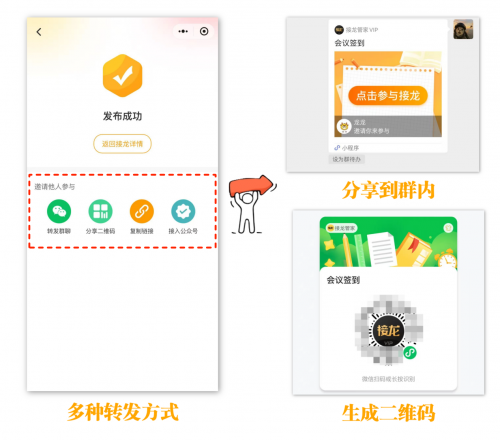 有多种签到分享方式,可生成二维码,直接打印张贴或投屏,同学们可以直接扫码签到,还可以直接转发群聊、分享链接,也可嵌入公众号菜单或文章,适应各种签到场景。