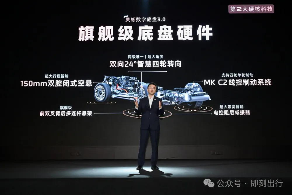 灵蜥数字底盘3.0的搭载,让这款车长近5.3米、轴距达3160毫米的豪华座驾实现了“大块头有大智慧”。同级唯一的双向24°智慧四轮转向系统,将转弯半径压缩至仅4.95米,狭窄路口与魔鬼地库皆能从容通过;150mm超大行程双腔闭式空气悬架搭配智能电控阻尼,兼顾高速过弯的平稳与碎石路面的滤震效果。