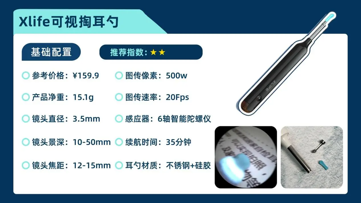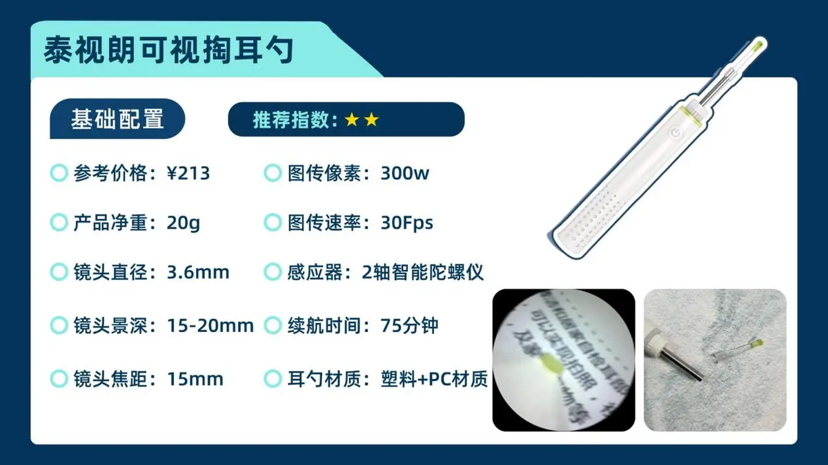 采用4轴陀螺仪,日常慢动作操作时画面稳定。配备多个可替换耳勺头,适配不同耳道大小。内置350mAh电池,续航约70分钟,使用Type-C充电,整体功能偏向基础实用。