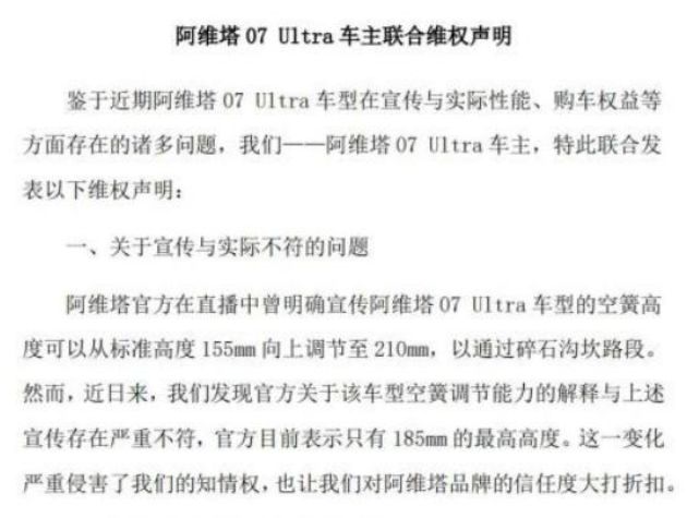 近期,各个汽车质量投诉平台显示,阿维塔 07 车主维权诉求持续升温。从Ultra 版车主质疑 “空气悬挂缩水 30mm”,到2024 款 Pro + 车主 “提车三月遇停产” 的投诉,相关投诉量短期内显著增长,这款背靠华为、宁德时代与长安汽车的车型,正陷入新旧迭代与宣传不符的双重信任危机。