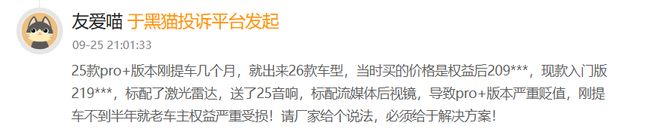 2025 年 2 月 18 日,阿维塔推出07 Pro + 版本,增程版售价21.99万元、纯电版22.99万元,仅半年后的 8 月便变相停产。5 月 8 日购车的车主提车仅 3 个月,就遭遇新款 “增配不加价”——2026 款车型标配激光雷达、流媒体后视镜,升级华为乾崑 ADS 4.0 系统,指导价却与老款一致。更让车主愤怒的是,厂家明确停产计划后仍继续售卖 Pro+,未履行告知义务,被疑 “恶意倾销”。老车主权益损失明显:部分门店 Pro + 库存车甩卖价降至 15 万元左右,较 20 余万元的购车价缩水近 30%,官方未提保值补偿;老款后窗无雨刷、悬架体验差等缺陷,新款虽已解决,但老车主需自费 6580 元升级流媒体后视镜、4000 元优化悬架,被指 “二次伤害”。