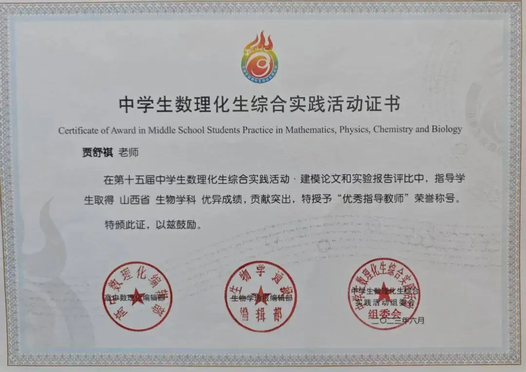 学科竞赛是培养学生创新思维与实践能力的重要平台,贾舒祺老师主动担任学校生物竞赛的重责,从筛选参赛学生到制定 “基础夯实 — 专题突破 — 模拟冲刺” 三阶指导计划,都亲力亲为,任劳任怨。他指导的学生在 “第十五届中学生数理化生综合实践活动” 中荣获省级一等奖;他本人也于 2023 年 3 月、6 月两度获评 “省级优秀指导教师”。