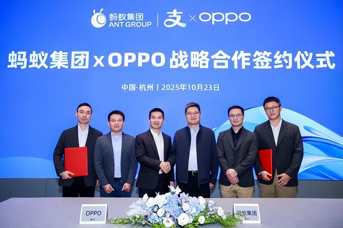 2025年10月23日,杭州——OPPO与蚂蚁集团举行战略合作签约仪式,双方将在AI智能体、服务生态、“碰一下”、医疗健康服务、保险、用户体验等方面展开深入合作。