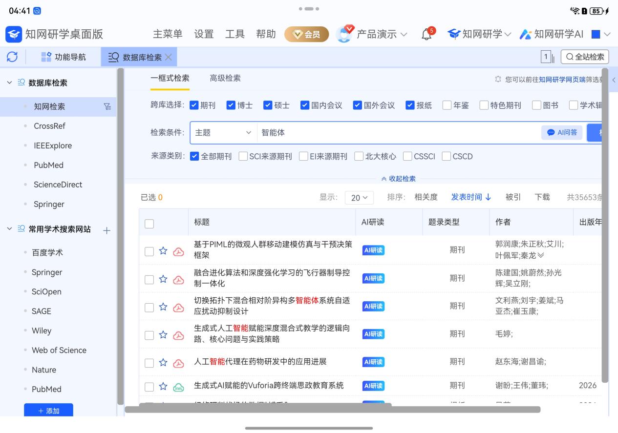 而且在鸿蒙版知网研学里,它内嵌了100多个中英文数据库,支持AI中英文献研读,还能用AI进行辅助写作和润色等等。而且,不管是手机、平板还是电脑,账号一登,所有的文献和笔记实时同步,过年回家不想带电脑,带个手机照样能利用碎片时间给大脑“充电”。
