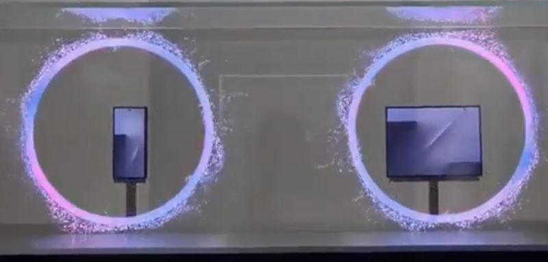 不同于一般折叠屏手机,Tri-Fold Phone采用了双转轴设计,共有两个可折叠的铰链,可以将一整块内屏折叠成三个区域,展开状态下接近一台10英寸的平板电脑的尺寸。外屏尺寸约为6.5英寸,与Galaxy Fold 系列相近。不过现场仅能透过玻璃展示柜观赏,无法实际操作。