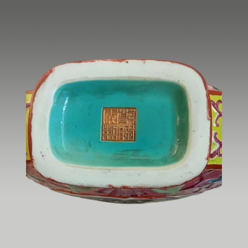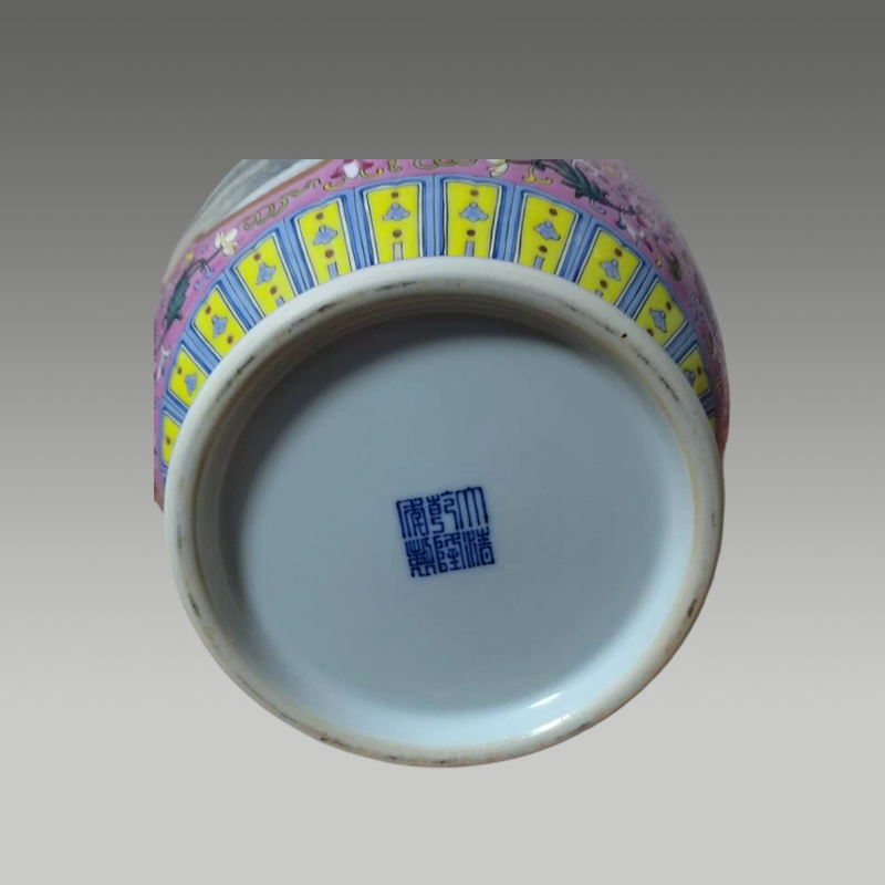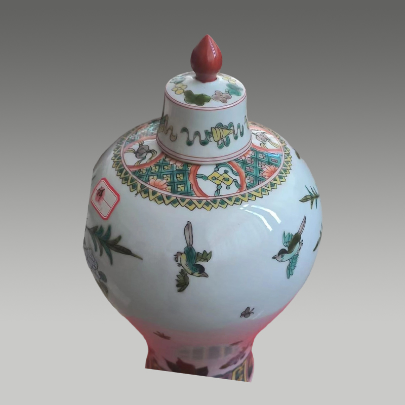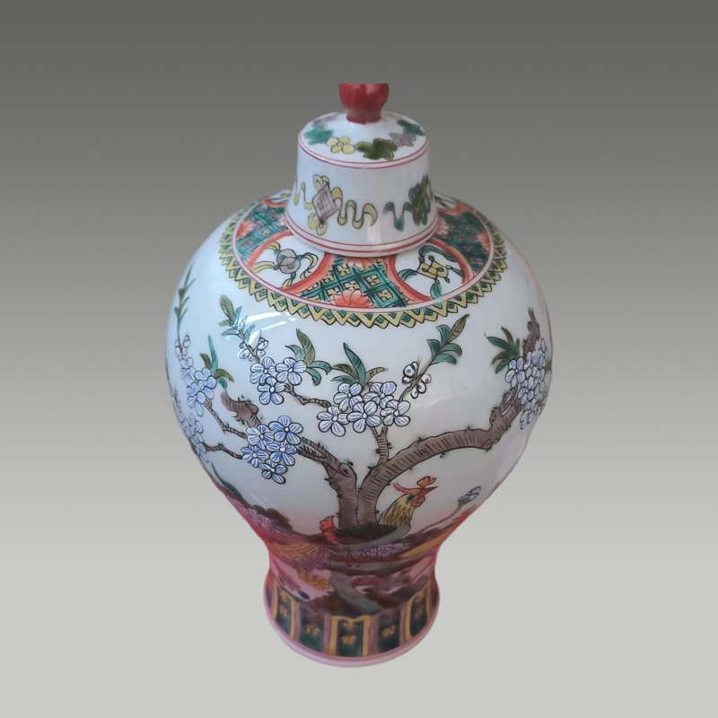 此梅瓶形制端庄,五彩斑斓绚丽,绘花鸟争春,笔触灵动。釉色莹润,构图雅致,繁花翠羽相映成趣