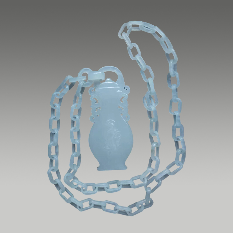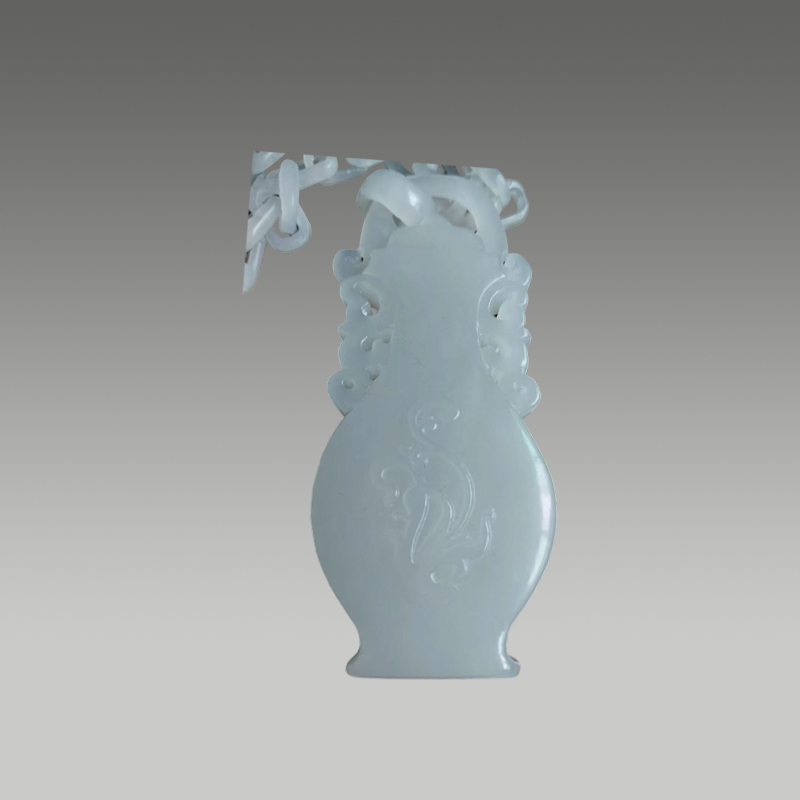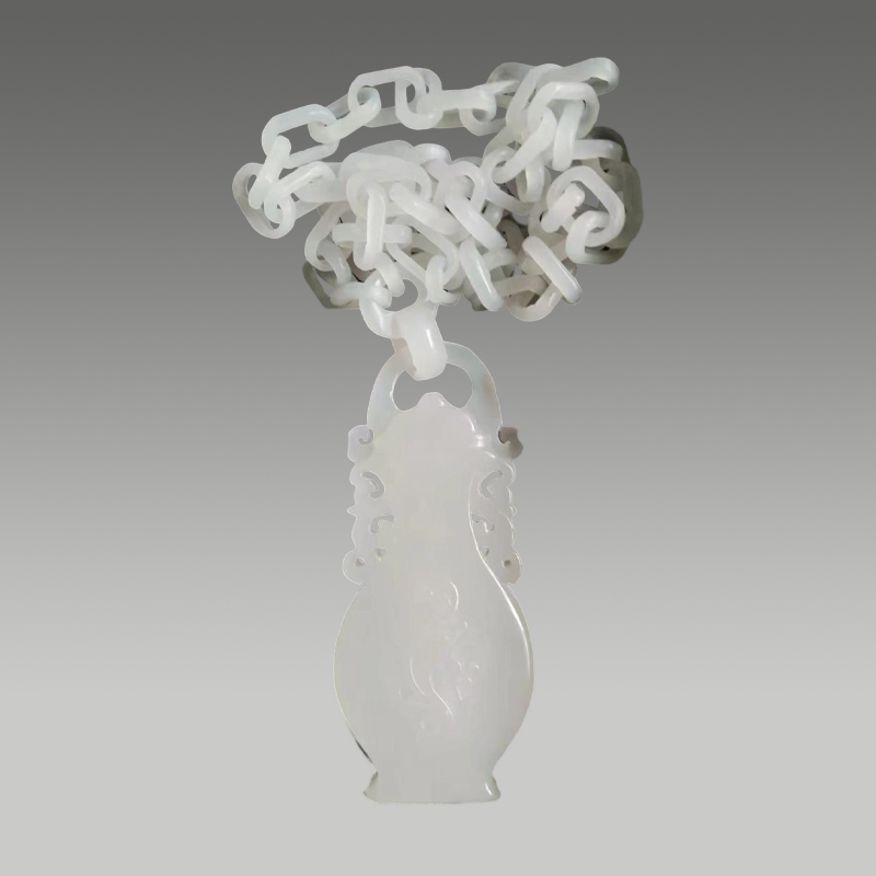 这件和田玉花瓶吊坠,玉质温润细腻,白润莹洁。一体活链工艺精巧灵动,瓶身雕工雅致流畅,造型端庄