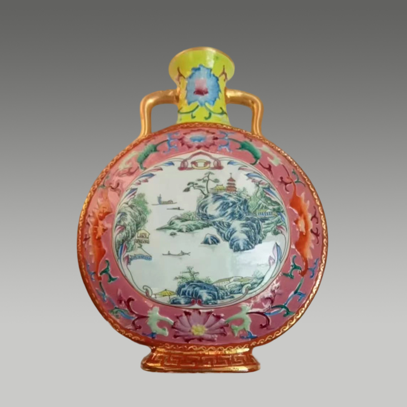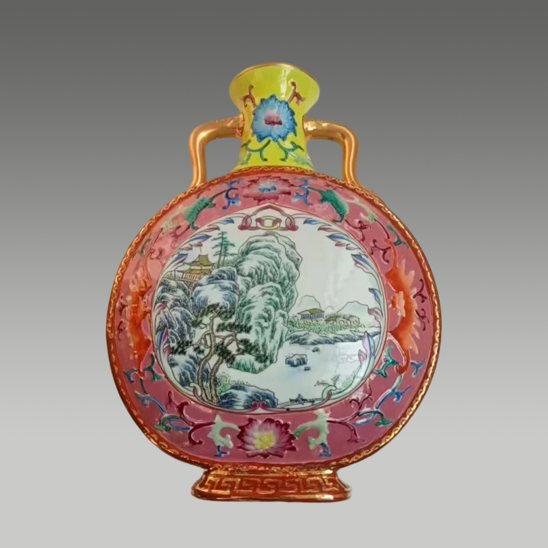 这只双耳扁瓶釉色明艳,描金点缀贵气天成,开光山水清逸雅致,纹饰繁而不乱,尽显瓷艺的精巧与华美