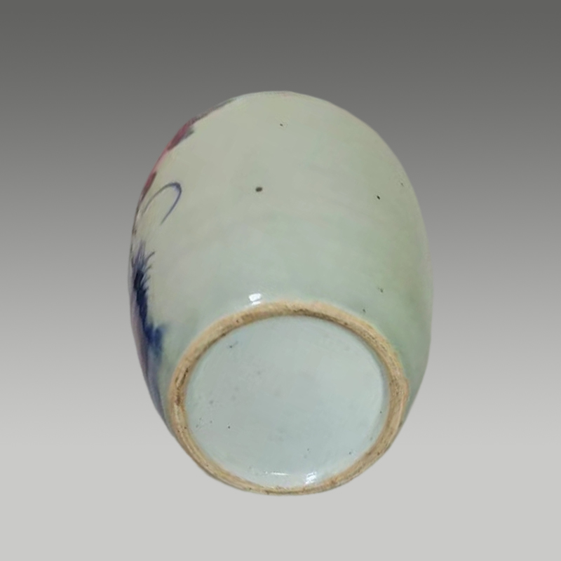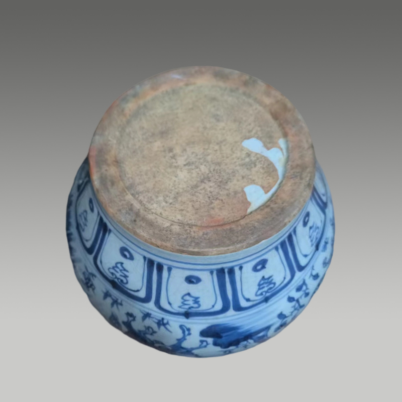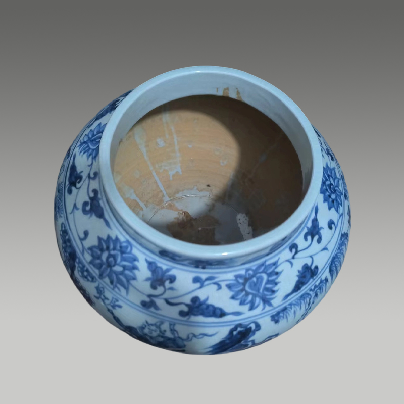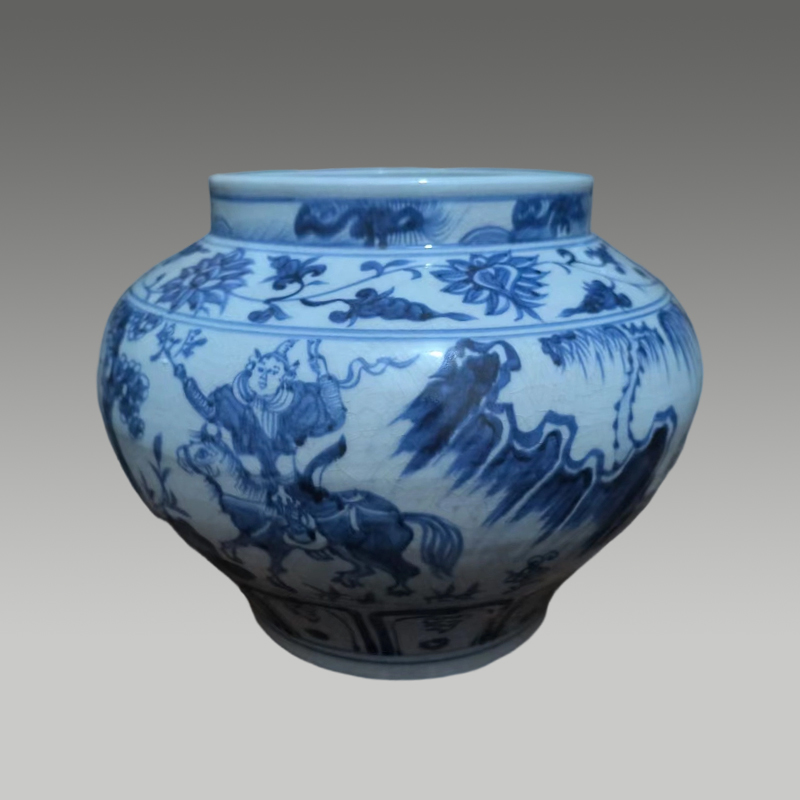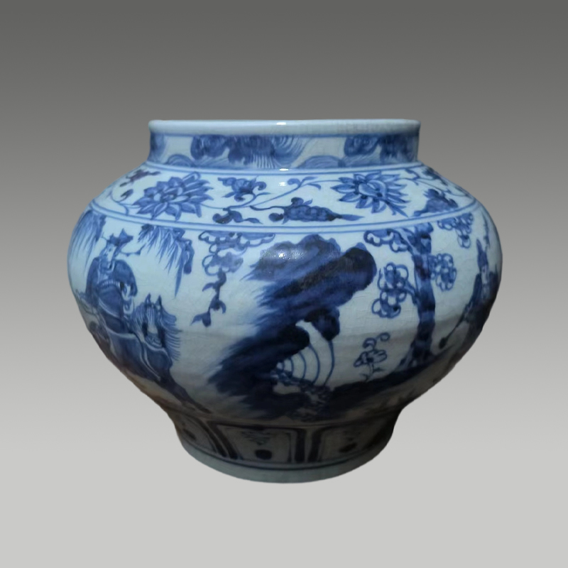此青花罐器型饱满周正,釉面温润开片自然,青花发色浓丽层次丰富。通身绘人物故事与缠枝花卉,笔触苍劲流畅