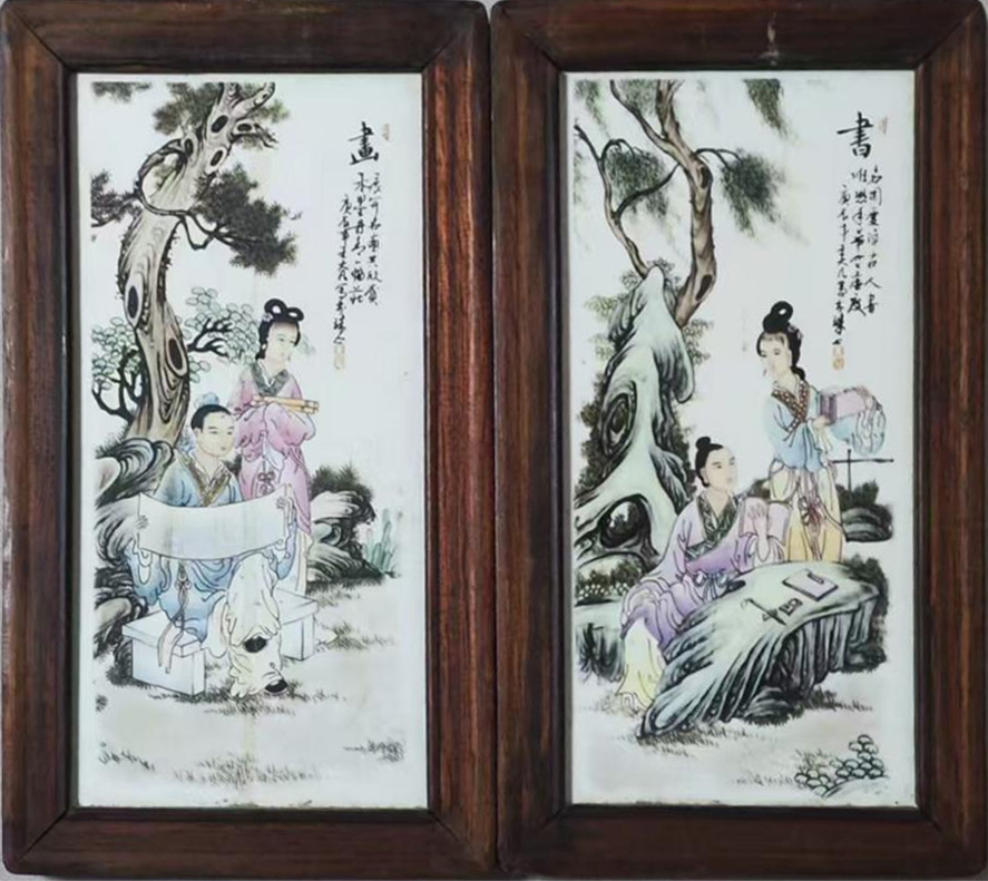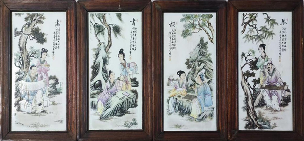这组瓷板画以琴棋书画为韵,笔墨清雅,人物神态温婉,草木山石意趣盎然,尽显东方雅致风骨