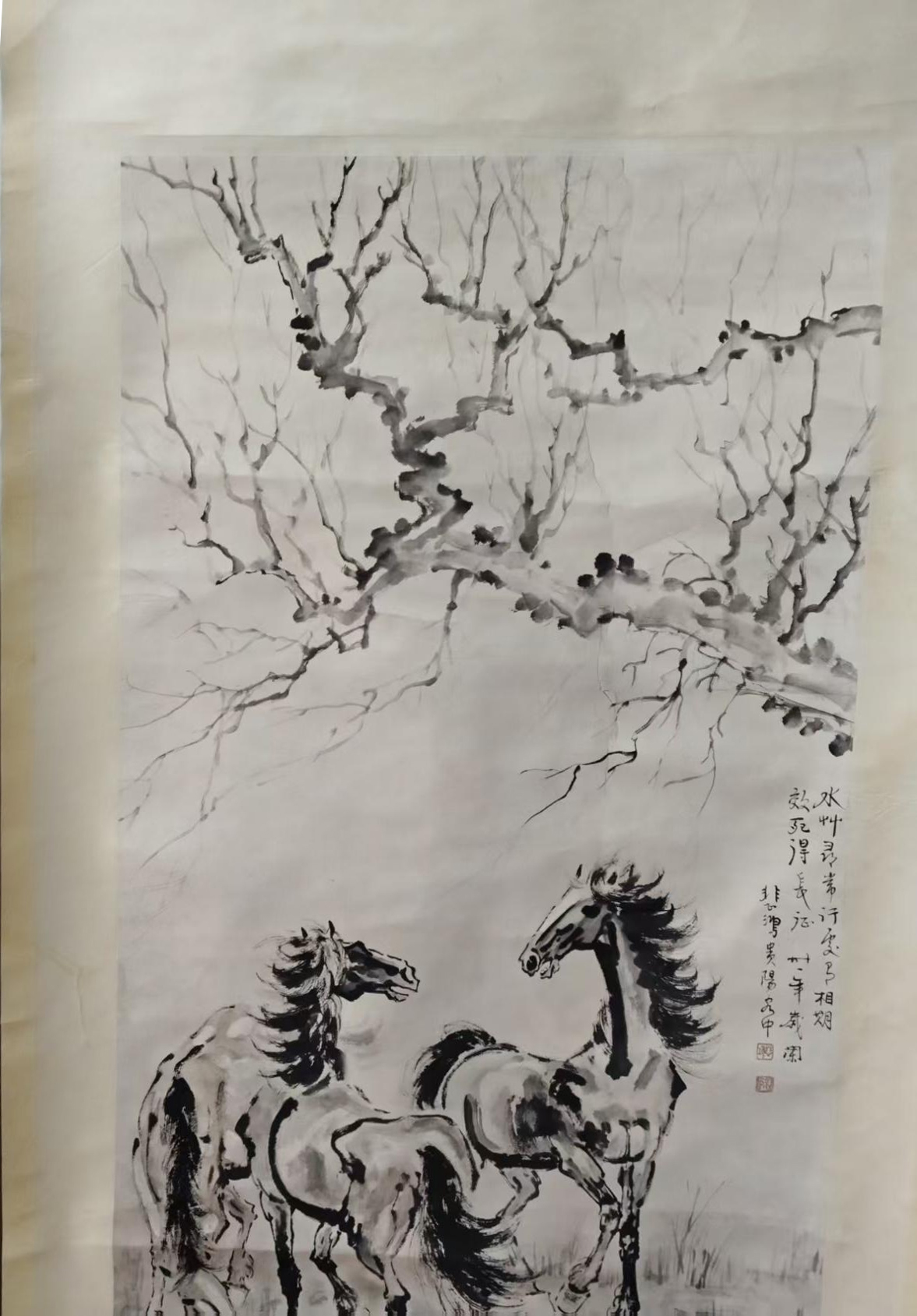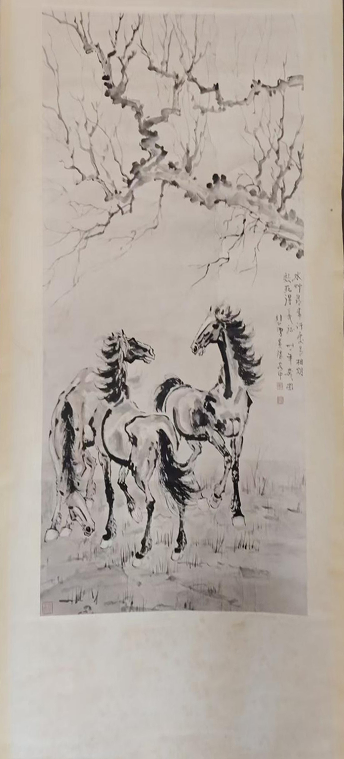 此作以劲健笔墨写三骏,寒枝为衬,风骨凛然。骏马昂首嘶鸣、顾盼生姿,墨色浓淡相宜,尽显奔逸之态与不屈精神