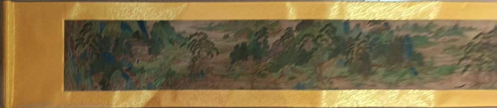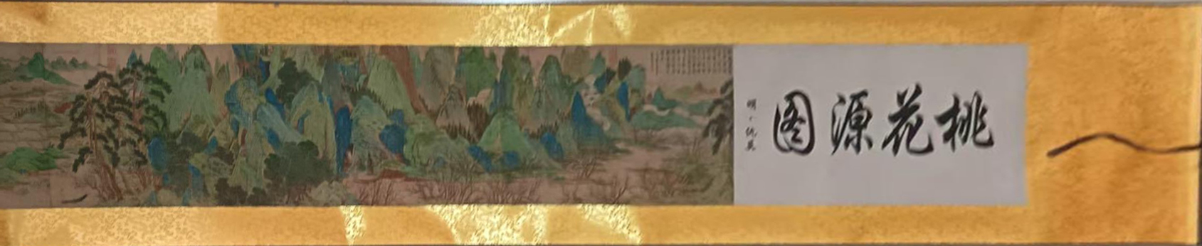 以青绿重彩铺就世外仙境。层峦叠翠间,桃林灼灼,溪桥茅舍错落有致,将“鸡犬相闻、怡然自乐”的理想田园