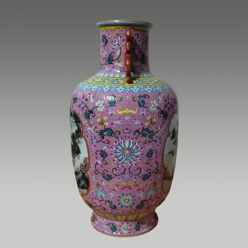 此瓶通体粉润雅致,釉彩明艳却不俗气。瓶身双螭龙耳灵动,开窗绘松鹿图,寓意福禄绵长,整体精工细作