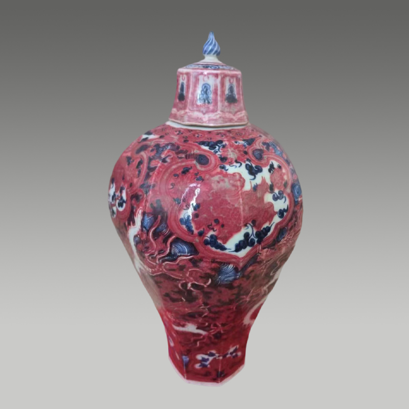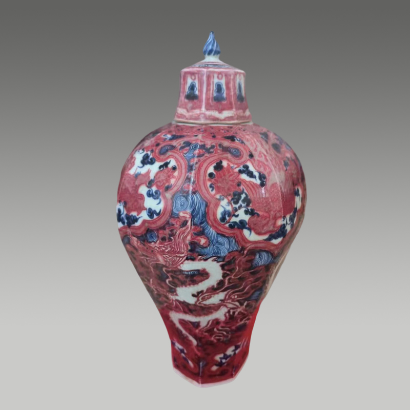 此瓶釉里红凝艳如霞,青花幽邃似海,留白雕龙气韵飞动。八方器型端庄雄浑,红蓝相映