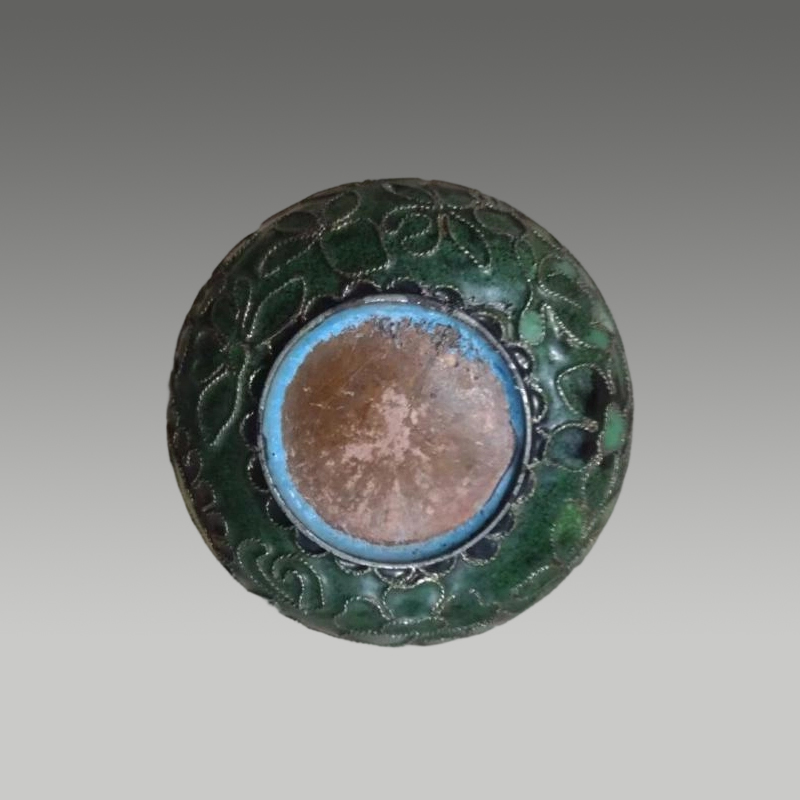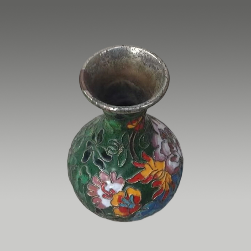 这掐丝珐琅小瓶,铜丝勾勒出繁花脉络,绿釉为底衬得彩釉明艳,瓶型秀雅,流光间藏着东方匠艺的精巧