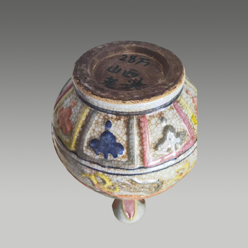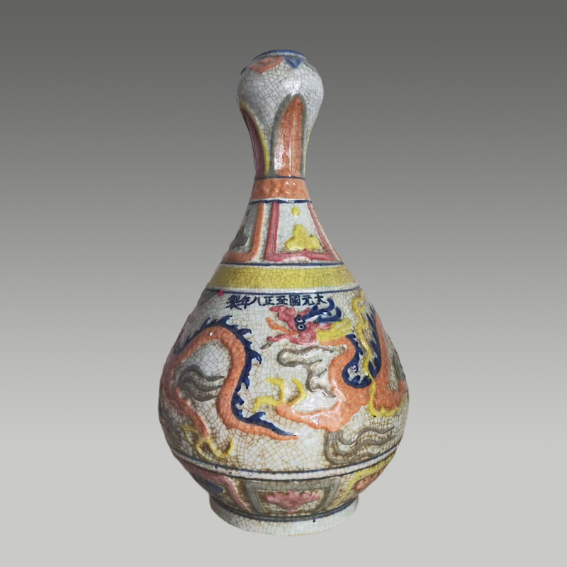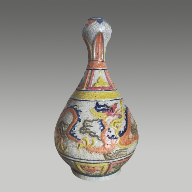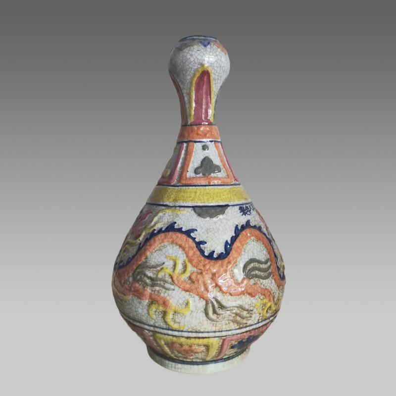 此瓶蒜头造型别致,开片纹理自然,五彩龙纹矫健生动,色彩浓艳明快,纹饰层次分明,尽显雄浑大气的艺术张力与匠心巧思