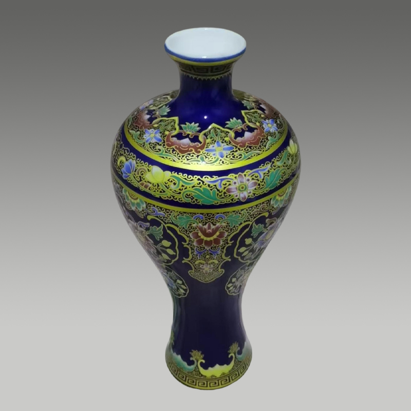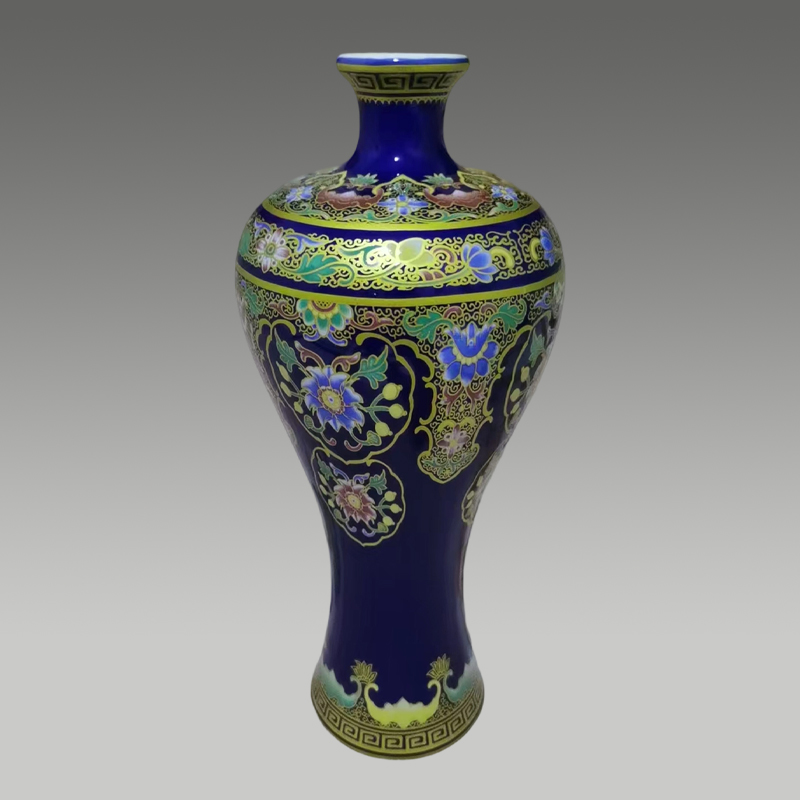 霁蓝釉色莹润华贵,描金缠枝花卉灵动雅致,器型挺括秀美,纹饰繁复精巧,色彩浓艳明快,尽显匠心工艺与东方雅韵