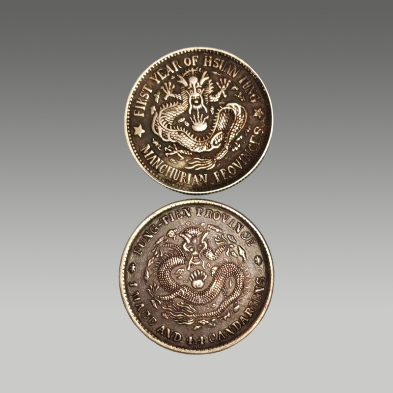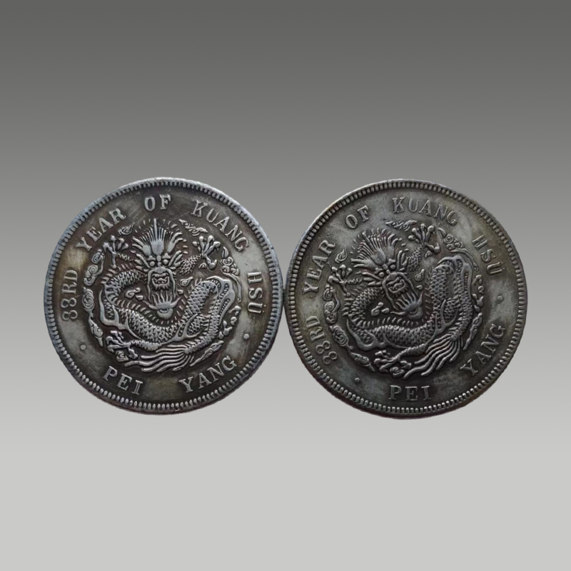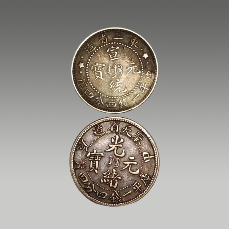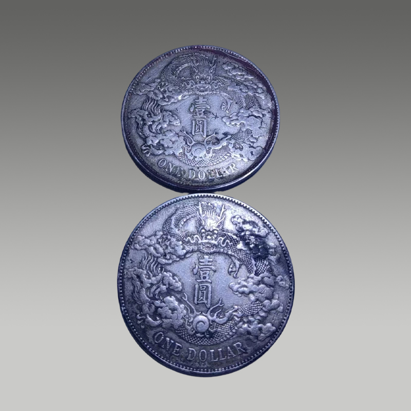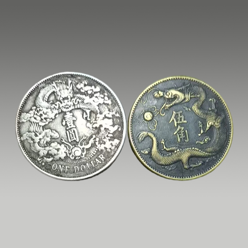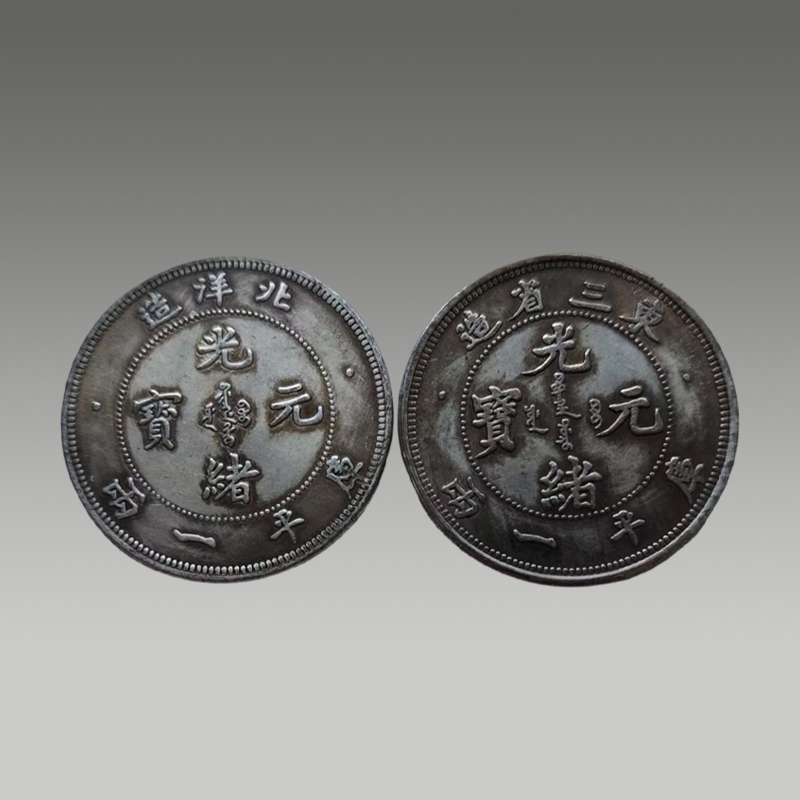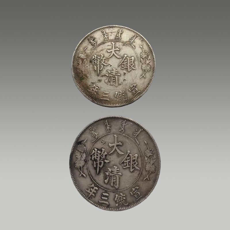 两枚银圆并置,曲须龙盘旋灵动,菊纹规整,文字端雅。包浆温润厚重,工艺精湛,承载百年沉淀