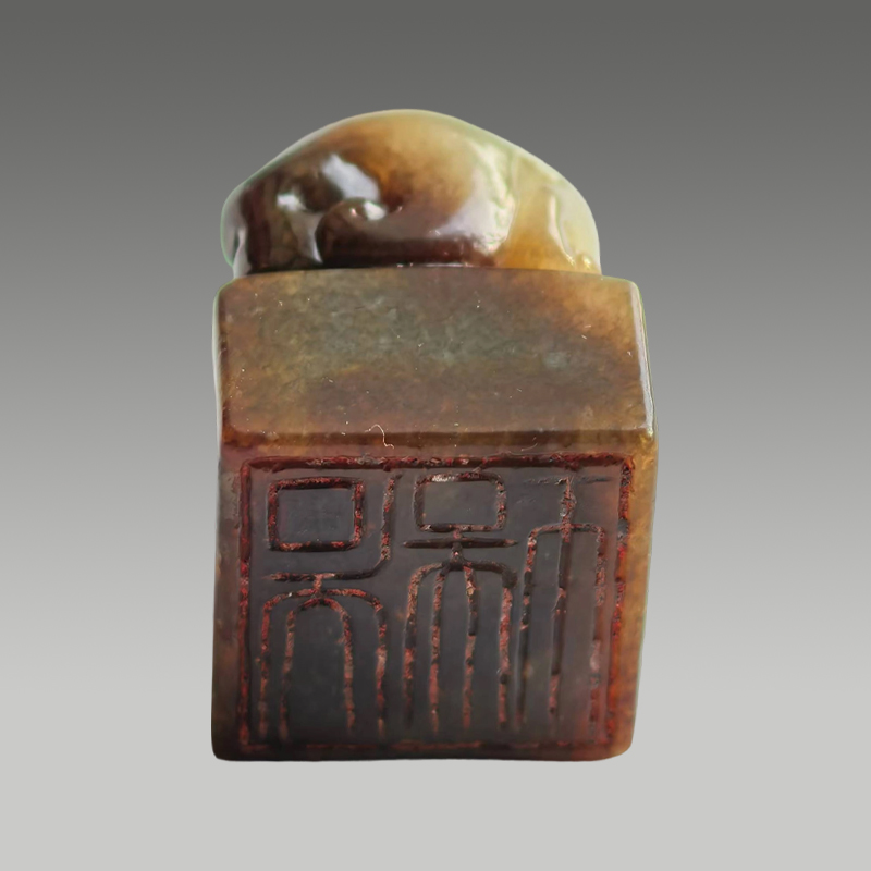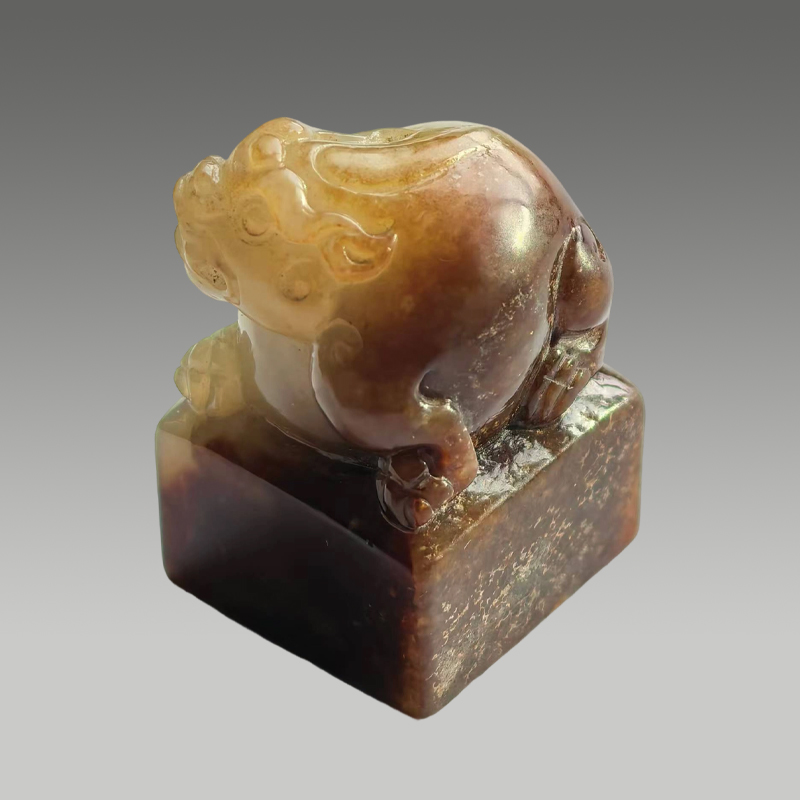 此玉印脂感温润,糖沁浓淡交融,瑞兽蜷卧方台之上,神态憨拙不失威仪,肌理圆融饱满,包浆沉静厚重