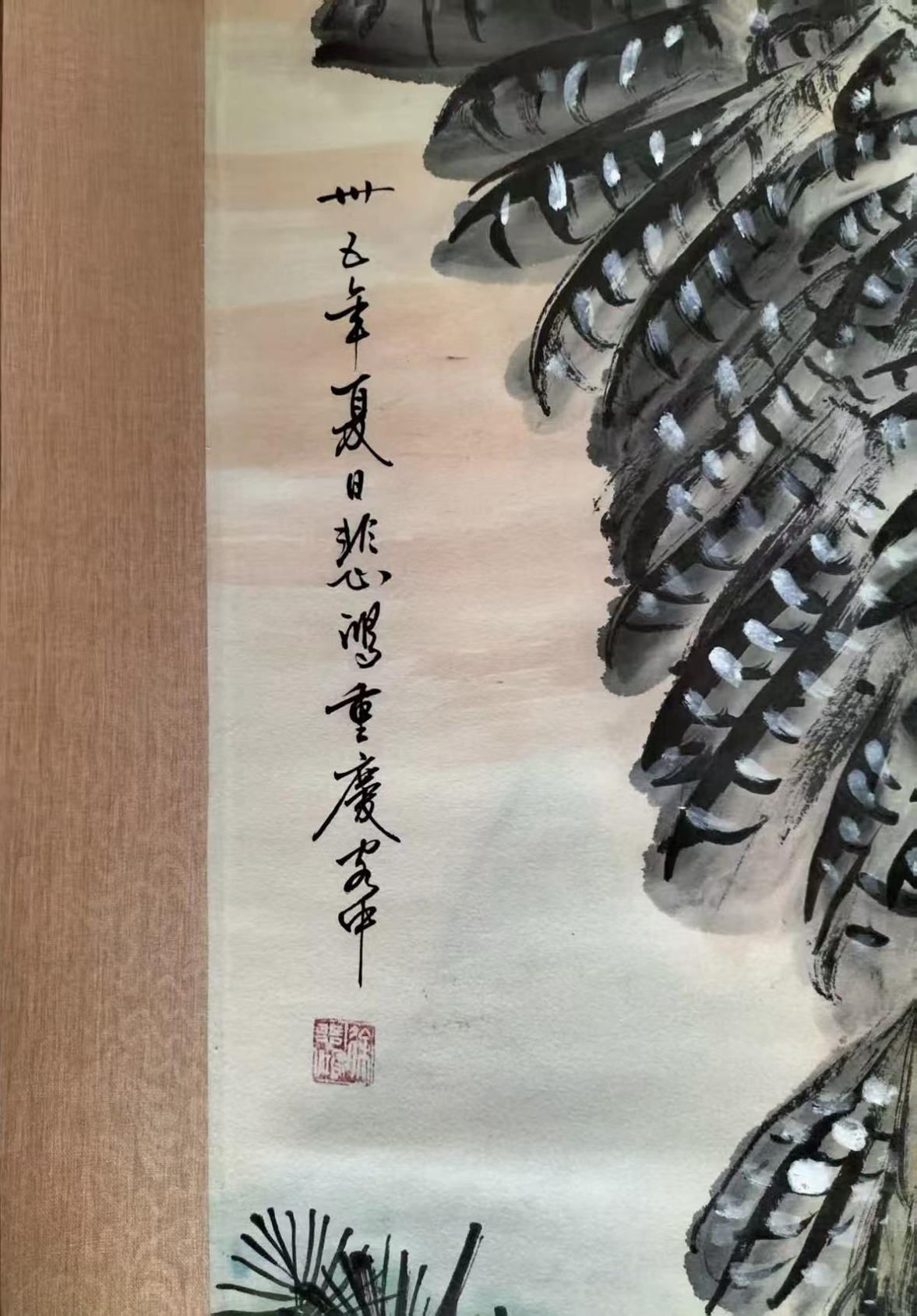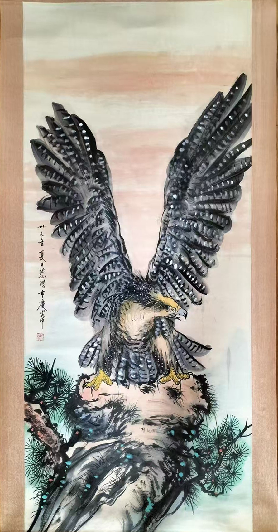 此作绘雄鹰振翅立苍松危石之上,笔墨苍劲雄浑,羽斑层次分明,松针劲挺,尽显凌云壮志之态